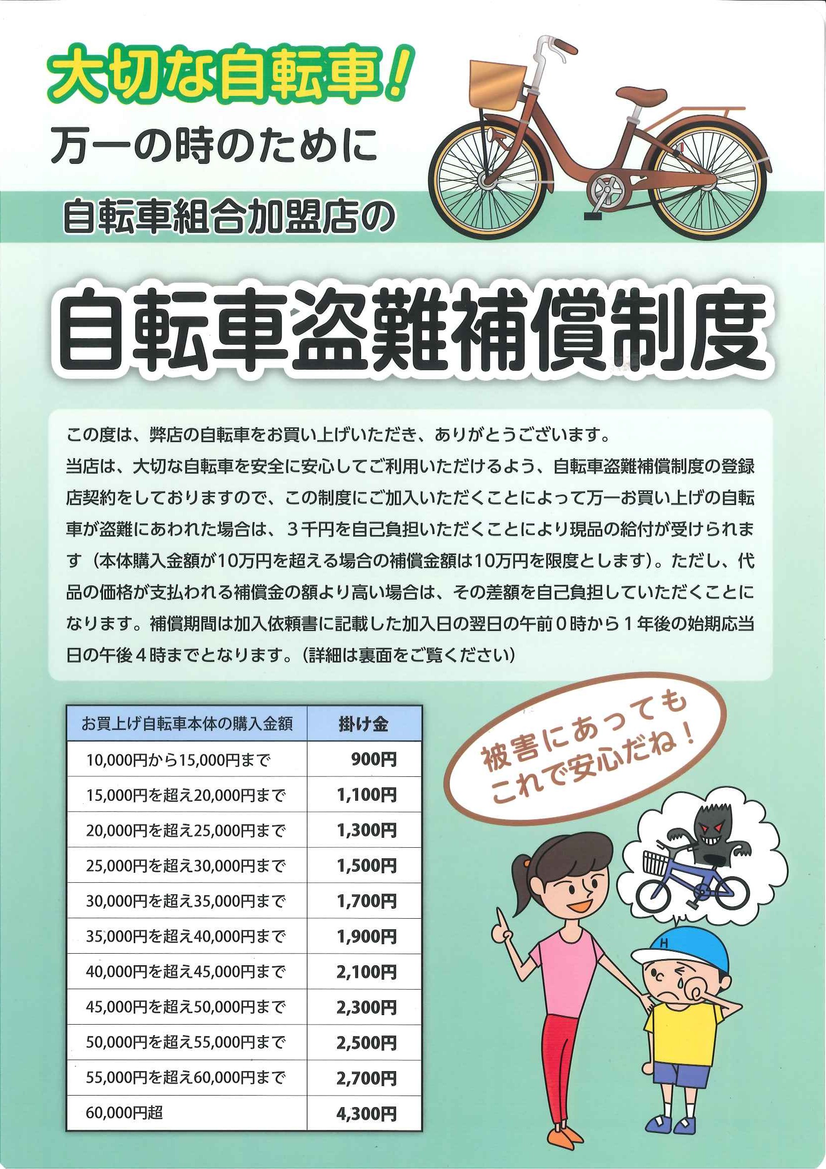 自転車組合 自転車盗難補償制度自転車盗難補償制度とは、お買い上げいただいた大切な自転車が万一盗難にあわれた場合、現品と同じ物または同等の自転車を補償する制度です。