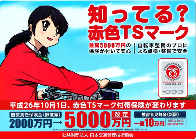 自転車安全整備士が点検整備した普通自転車に貼付されるもので、このマークには損害保険と賠償責任保険が付いています(付帯保険) ※「TS」とはTRAFFIC SAFETY(交通安全)の頭文字をとったものです。 ■TSマーク付帯保険とは?■ (1)TSマークに付帯された保険です。 (2)保険の対象は、点検年月日と自転車安全整備士番号が記載された保険有効期間中のTSマーク貼付自転車に搭乗中の人が対象となります。 (3)保険の有効期間は、TSマークに記載された点検日から1年間です。 (4)保険契約は、公益財団法人日本交通管理技術協会と三井住友海上火災保険(株)を幹事会社とする損保会社との間で締結しています。 詳細はこちらをご覧ください ※ご加入の際は当店にて指定の点検整備を行ったのち発行、貼付致します。尚、点検整備の際にかかる費用は別途頂戴いたします。 |